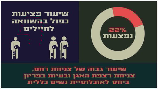 ‘A folk tale’ (Brothers at Arms, April 2017). [Hebrew wording on the slide, top to bottom, right to left: “22% are injured”; |rate of injuries are double comparted to male soldiers”; “high rates of uterine prolapse, pelvic organ prolapse and fertility issues compared to the general female population”] (Supplementary Materials).