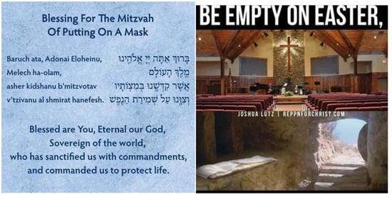The most prominent positive framing of religion within the social distancing memes studied suggested religious groups should be encouraging the upholding of social distancing COVID-19 protocols (Figure 5). Many memes exhorted churches and other houses of worship to publicly affirm health and safety edicts and practices, and that affirming social distancing was more than a choice but a responsibility for religious groups. For instance, one meme featured an image of an empty church alongside a depiction of Jesus’ empty tomb with the text, “Be empty on Easter”. This meme tells a story that acknowledges the realities of a prominently altered church ritual—the church gathering itself—while tying that altered reality to the sacrificial story of Jesus and the transcendence of His actions. The meme effectively argues that just as Scripture teaches that Jesus transcended the limitations of death, Christians can transcend the limitations of COVID-19 through right, Christ-like action. Though the theological equivalence of an empty church and the empty tomb is suspect, the evocation of the tomb in the imagery of the empty church positively frames the sacrifice of Christians not worshipping in person as a Christ-like thing to do. Likewise, one meme aimed at religious Jewish shared an explicit “Blessing for the Mitzvah of Putting on a Mask” that encouraged prayer for the action of putting a mask on, recognizing such an activity as obedience to Hebrew Scriptural commands to protect life.