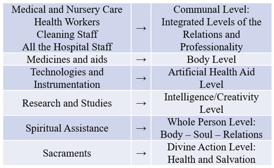 The Sacraments are thus not just something that is added to health care procedures but are instead something (a gift) that embraces the entirety of health care dynamism by conferring structural effectiveness; the Sacraments are in fact related to the integral dimensions of the Person. Finally, our complete approach can consequently be synthesized as follows (Figure 3):
