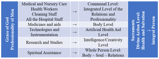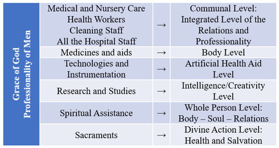 As is the case in the majority of the personnel’s awareness, the consciousness of the intervention of God’s Grace is the “engine” that collects all of these levels into one great Mission, in which Professionality is at the service of the Presence of God that is operating in force of His Incarnation, Resurrection, Gift of the Holy Spirit, and Power of the Sacraments. God acts together with man’s hands and professionality, and this action is in the direction of the mystery of God’s love, who is present, crucified and risen, inside the care process, simply because He said and He promised this. The previous scheme therefore becomes (Figure 2):
