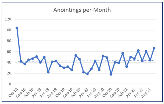 An important finding resulting from the data analysis is the interpolation line of the Anointings during the entire period: it is quite horizontal, with a value that is very close to the average of the data. We cannot individuate a significant variation in the data during the COVID-19 period; on the other hand, the data themselves were taken during continuous service. We do think that the value of the interpolation line could be important, not in a qualitative sense, but instead to indicate that through ordinary and unpredictable variations, the data are stable and maintain a constant mean value. That is to say that the data can be used to evaluate ordinary work throughout the entire study period. The natural variations are thus not referrable to specific events (Figure 4).