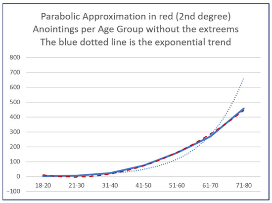 In terms of the distribution of the data by age group, excluding the extremes (0–18 and 81 upwards), a perfectly polynomial second-degree distribution (parabolic) is obtained, as seen in Figure 5, and is not as exponential as expected if the Anointings were conceived as a Sacrament that was only conferred in cases of advanced age (this is shown by the interpolation with an exponential approximation—dotted blue line—to demonstrate the clear difference in the evidence). On one hand, the linear trend is unexpected, as there would be an indistinct and constant distribution with respect to age, a result that would not take into account the greater incidence of the diseases in the older age groups. However, in theory, it would be more likely that a flatter curve would correspond with lower age groups and that there would be an exponential increase with age, which would take into account that this Sacrament is often only “asked” for the last moments of life. However, the parabolic growth is a surprise, which in fact “tears” away the idea that this is the Sacrament of consolation for a dying person (as it would be if the curve were exponential, that is, if the data were concentrated at higher ranges).