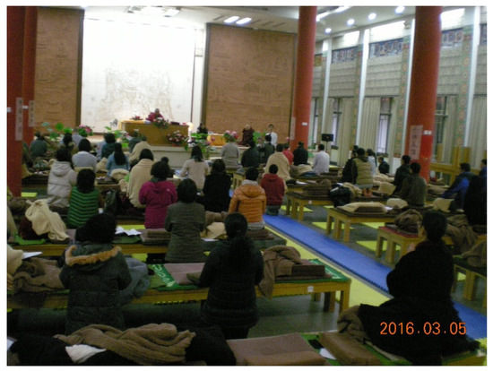 Buddhism has been progressively revived with many historical monasteries being reconstructed with fund raised from overseas (Ashiwa and Wank 2005); for example, the Bailing Chan Monastery 柏林禪寺, Yunman Monastery 雲門寺and Nanhua Monastery 南華寺. The number of Han Chinse monasteries and Buddhist clergy has been growing extraordinarily (Chiu 2019, pp. 165–66). There were more than 15,000 functioning Han Chinese monasteries and 100,000 Han Buddhist clerics in mainland China in 2006 (World Buddhist Forum 2006, cited in Ji 2013). Over the same period, a few films containing martial arts with Shaolin gongfu 少林功夫 had initiated “Chan fever” (chanxuere 禪學熱) (Ji 2011, pp. 32–52), arousing the popular interest of not only Buddhist tourism, but also Chan meditation practices.11 Regular seven-day Chan retreats (chanqi 禪七) were organized at a few historical Chan monasteries. A famous Chan monastery, with the heritage of Chan Master Zhaozhou 趙州, was reconstructed by Jinghui 淨慧, a disciple of the recent great Chan master, Xuyun (Wang 2019a, 2019b). Foyuan 佛源, an attendant of Xuyun who received the Yunmen lineage, rebuilt the Yunman Dajue Chan Monastery 雲門大覺禪寺 in Guangdong Province and revived the Chan retreat (Birnbaum 2003, p. 442; Wang 2019b)12. Regular seven-day Chan retreats (chanqi 禪七) were organized at a few historical Chan monasteries by the disciples of recent eminent Chan monks, such as Master Xuyun and Master Laiguo 來果. Traditional practices in Chan monasteries generally have been revived, including regular morning chanting (zaoke 早課) and evening chanting (wanke 晚課) at the main shrine hall, and silent meals (guotan 過堂) at the dining hall (zaitang 齋堂). Monks, nuns, laymen and laywomen can join practicing these rituals together. However, only monks could enter the few established Chan halls in the Han Chinese Buddhist monasteries in mainland China. However, Chinese nuns and laywomen were denied access to the Chan halls.
