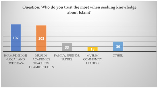 This study uses Weberian understandings of authority to ascertain who Muslims trust and go to for religious knowledge. For Weber (1978, pp. 126–27), legitimate authority is based on ideas of trust, non-violence and social recognition. Bryan Turner (2007, p. 119) similarly claims a religious leader in Islam gains legitimacy because of popular recognition and support in what he calls “a local, discursive and popular form of authority”. Among the survey questions, participants were asked who they trust most in seeking Islamic knowledge. Survey participants were provided six options: (1) local imams/sheikhs; (2) overseas imams/sheikhs; (3) Muslim academics in the field of Islamic studies; (4) Muslim community leaders; (5) families, friends and elders; and (6) other. The “other” category allowed respondents to enter actors not mentioned in the survey options. See Figure 1 below.