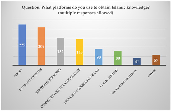 Survey and interview participants identified the internet and other digital devices as an important communication and marketing tool. According to survey results of 300 Muslims, the most sought-after platforms were books (22.5%), websites (21%), sermons (15%) and community-run Islamic classes (14.5%). Under “other”, participants cited podcasts, YouTube, social media, Qur’anic study circles, local imams and institutions, family, friends and Islamic retreats (rihlaat) (see Figure 2 below).