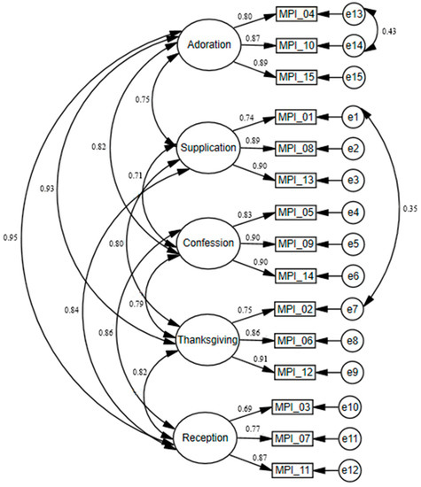 The analysis of the matrix of rotated factor loadings showed an internal structure of the MPI consistent with the original MPI (Laird et al. 2004). Based on Kaiser’s criterion (eigenvalue higher than 1), five factors needed to be distinguished, explaining 82.98% of the total variance. Table 1 contains the MPI items, their factor loadings, and the percentage of variance explained by each of the factors. The MPI included five factors. Factor 1, Thanksgiving, includes three items that measure expressions of gratitude for life circumstances; it explained 57.50% of the total variance. Factor 2, Supplication, includes three items that measure requests for God’s intervention in specific life events; it explained 8.40% of the total variance. Factor 3, Confession, includes three items that measure acknowledging faults, misdeeds, or shortcomings; these items explained 7.10% of the total variance. Factor 4, Reception, includes three items that measure passively awaiting divine wisdom or guidance; these items explained 6.13% of the total variance. Factor 5, Adoration, includes three items that measure the worship and praise of God; these items explained 3.88% of the total variance. In summary, the results of the MPI replicated the five-factor structure of the original MPI. The internal consistency indicators of the subscales in this sample were as follows: Adoration α = 0.92, Supplication α = 0.86, Confession α = 0.91, Thanksgiving α = 0.90, and Reception α = 0.85.