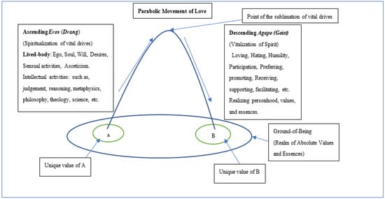 The visualization shows a parabolic movement of the attributes of love, eros, and agape, which could be said to move in an upward and downward direction as we saw above. Ascending eros is characterized by the striving of the ego, through asceticism, to attain knowledge; while descending agape is characterized by spiritual participation and service through which value or essence is given. It is in this descending movement of love that the whole person participates in the spiritual act of loving service that, as Arthur R. Luther puts it, provides “space” for the beloved person to be.” (Luther 1970, p. 225). This means promoting, supporting, and in fact, “facilitating” the beloved to attain a higher being of value (Vacek 1982, p. 163). It should be noted that to be for Scheler is having the capacity for emotive spiritual loving, by participating and realizing one’s unique value. Providing space for a person to be in this sense may not be reduced to Heideggerian or Derridarian “letting be”, which refers to what thought gains access to the Other (Serafini 2016, pp. 484–85). The descending movement of agape is thus characterized by the givenness and realization of values, the highest of which are the religious values such as awe, humility, repentance, reverence, and bliss.19 It is the realization of values that constitute the history of the world as the unfolding of the “World-Ground” (der Weltgrund) or “Ground-of-Being”. For each unique value realized in a person or object is the eternal substance in them (Frings 1980, p. 142) that is received when a person A promotes the realization of the unique value of B. I argue elsewhere that for Scheler values are realized and received only in this descending movement of agape, by which I define his concept of humility. Values are in this sense felt as gift-wrapped in humility.20