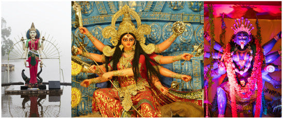 Here we see three expressions of Śakti, Śiva’s consort. On the left we have Pārvatī (picture by Robertobinetti70, Canva), who looks very much like Lakṣmī: attractive. Then in the middle we have Durgā (picture by Pabitra Chakraborty, Canva), who is attractive but also fierce, displaying various weapons. On the right we have Kālī (picture by anonymous, Canva), who is outraged over the evil she destroys.