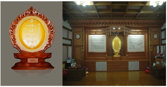 The Jingak group pursues the prosocial characters of Pragmatic Buddhism with the aim of embodying genuine enlightenment and true belief.28 As part of the internal policy of the reform efforts, the followers of Jingak prefer the convenience of a ritualized life (; ). In particular, they have neither a Buddha statue nor a moktak (木鐸, wooden percussion instrument the Buddhist clergy use for chanting) in the temple. Instead, the wooden plate of the flaming figure mantra of “Aum(Oṃ) Maṇi Padme Hūṃ” is located at the center of the Buddhist shrine (left of Figure 2). The names of the Thirty-Seven Deities of Vajra-dhatu Mandala (the collective names of Five Buddhas and 32 Vajra-Bodhisattvas) (right of Figure 2) are inscribed on each side of the altar ().29