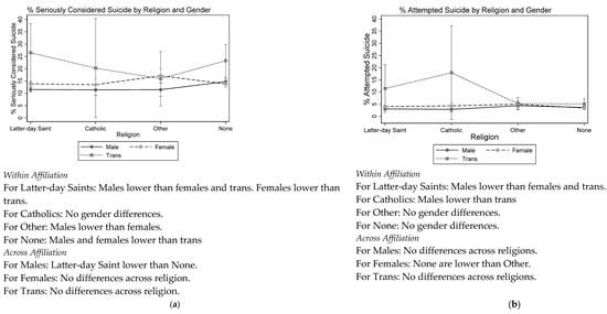 There were no significant interactions between affiliation and sexual orientation. That is, the effect of affiliation (which was non-significant) did not vary by sexual orientation. The interaction between affiliation and gender was significant for each outcome (see Figure 1). Gender differences were tested within each affiliation and across affiliations with the Bonferroni correction for the multiple comparisons. Regarding suicidal ideation within affiliation (Figure 1a), for Latter-day Saints, males were lower than females and transgender; females were lower than transgender. For Others, males were lower than females. For Nones, males were lower than females and transgender. Across affiliations, Latter-day Saint males were lower than None males. There were no gender differences across affiliation for females and transgender. Regarding suicide attempts within affiliation (Figure 1b), for Latter-day Saints, males were lower than females and transgender. For Catholics, males were lower than transgender. There were no gender differences for Others and Nones. Across affiliations, there were no differences for males and transgender. However, None females were lower than Other females.