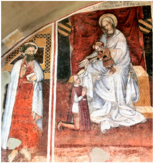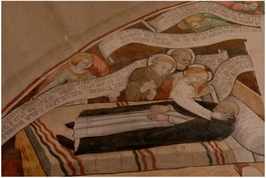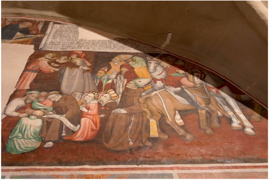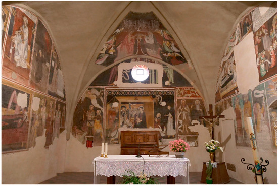 The apse of the Santa Maria Assunta chapel is home to a complex fresco cycle from the Late Middle Ages (Griseri 1965, p. 134; Monetti 1978a, 1978b; Di Macco 1979; Kaftal 1985; Baiocco et al. 2003, pp. 117–19; Kovalevsky 2002; Bertolotto et al. 2011; Calvé Mascarell 2016, pp. 323–35; 2020) (Figure 2).
