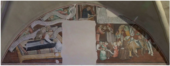 The lunette on the right-hand wall is where the two scenes with Vincent Ferrer as the protagonist appear, accompanied by the aforementioned fragments of text. Each of them is framed and adjacent to the other, but the bottom part where the connection was made between them suffered irreparable losses (Figure 5).