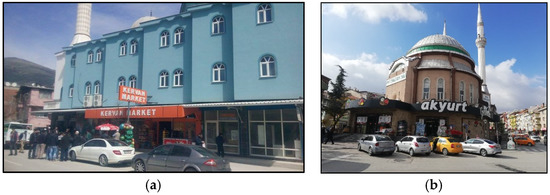(a) İzmir Başdurak Mosque is located at the lower level of the large-scale commercial unit (b) Afyon Yoncaaltı Mosque, where small-scale commercial units are located at the lower level.