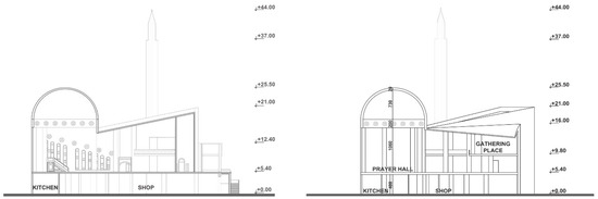 In the period between 1923 and 1950, which came after the establishment of the Republic, a new state was built, and all institutions were restructured. The new state that was established needed new buildings but, due to economic problems and the scarcity of building materials, they could not be built, and the existing buildings were used for functions that were deemed necessary (Obuz 2017). In the following years, with the industrialization movements of Turkey, a rapid migration from the village to the city started. Intense population growth caused unzoned urbanization and irregular construction and, therefore, the number of mosques, which were compressed in the dense urban fabric, increased rapidly. Mosques tended to integrate with their sub-units rather than the surrounding units. For the visibility of the mosque, functions, such as a bazaar and a car park, were added to the lower floor by raising the mass (Duysak 2000). Mosques, which started to undertake different additional functions in line with both financial and environmental needs and trends, have been interpreted with different perspectives within the society, administration, and laws, and have become a subject of discussion. Discussions were not limited to the spirituality of mosques, but developed in many ways, such as urban rent, deterioration of functionality, and proportional imbalances between the building and its surroundings. This situation is seen not only in mosques built by the public, but also in mosques built by the state. The Kocatepe Mosque program, which stands out as the largest mosque project to be built in the Republican era, includes a place of worship, a courtyard, offices of the Ministry of Religious Affairs, a library, a conference hall, commercial offices, administrative units, and parking lot (Türkiye Diyanet Foundation 2016). The fact that there is a supermarket under the mosque paved the way for the trade and religious buildings including the small place of worship (Figure 4).