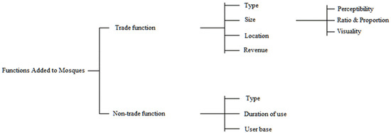 In the functionality analysis conducted to define diversity in the focus group interviews, it was determined that the problems caused by the functions added to the mosque depended on different variables (Figure 19). The trading function created a problem primarily because users thought that the spirituality dimension was negatively affected. The presence of such a unit in a holy place where people come to worship affects some of the congregation and causes them to even change the mosque they regularly attend. The mass that continues to come to the mosque is affected by the type of trade function, its size, location, and the income it earns.