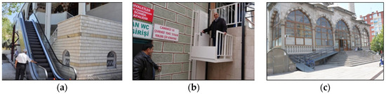 (a) Meltem Mosque, escalator solution; (b) Green Mosque, elevator solution; (c) Melikgazi Mosque, ramp solution.
