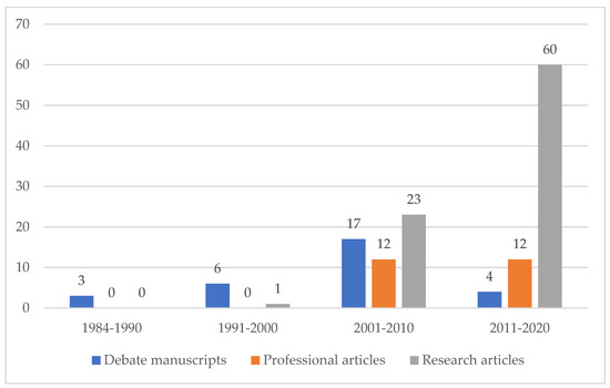 The number of debate manuscripts also continued to increase (see Figure 2), dealing with issues such as lack of competence in approaching the patients’ need for existential dialogues (Bischofberger 2000), questions such as whether the patients’ ‘inside’ is the healthcare services’ responsibility (Jacobsson 2001) and meaning (Holm 2003; Skaiå 2003).