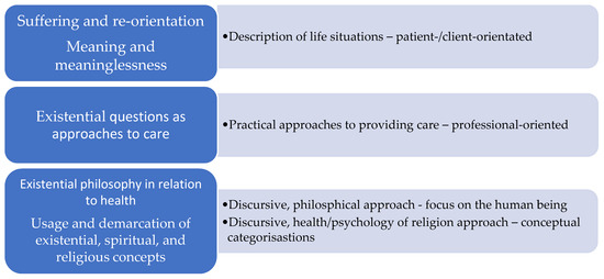 Figure 3 illustrates the three dimensions that emerged from the overarching themes. The first dimension, which included ‘suffering and re-orientation’ and ‘meaning and meaninglessness’, focused on the patients’ and clients’ life situations. The second dimension, drawn from ‘existential questions as approaches for care’, emphasised practical approaches for professionals providing care. The third dimension, which included ‘existential philosophy in relation to health and the ‘usage and demarcation of existential, spiritual and religious concepts’, underlined discursive debates on the human being and conceptual categorisation.