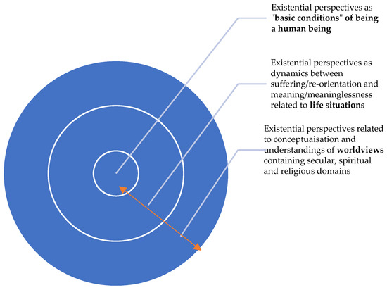 In arguments using existential as an umbrella concept, the concept included spiritual, religious and secular domains (DeMarinis 2003, 2008; Frøkedal 2020; la Cour and Hvidt 2010). ‘Existential’ as an overarching concept provides a framework that includes the secular domain, as well as the spiritual and religious spheres.