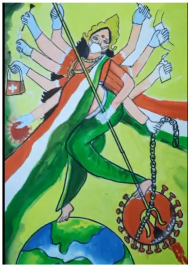 Early in the pandemic another image of Bhārat Mātā appeared, this time taking on the role of ‘doctor’—thereby fitting the longstanding pattern of a Hindu deity being at once the affliction and the antidote thereof. As Ramaswamy has argued, this new incarnation (avatāra) of Bhārat Mātā as a disease-fighting deity primarily manifested herself through the interventions of an apparently secular art practice (Kaur and Ramaswamy 2020, p. 78). During the first wave of the pandemic, in 2020, no temples for this new goddess were built and no unique worship or ritual emerged. She mostly existed in the digital media and had varied appearances on the basis of the imagination of the artist. Her iconography, at this time, was still unstable, with elements borrowed from the old, the near-new, and the entirely novel; however, some distinguishing features started to emerge to accommodate the new, unique demands of the situation, including the emergent policy of social distancing with which she came to be associated. She is almost always a multi-armed goddess. Interestingly, in the artistic representation, despite the unstable iconography, Corona Goddess was imagined as a combination of Bhārat Mātā and Durgā. Of course, the iconography of Bhārat Mātā itself borrows heavily from the iconography of Durgā/Mahiṣāsurmardhinī (Ramaswamy 2010).