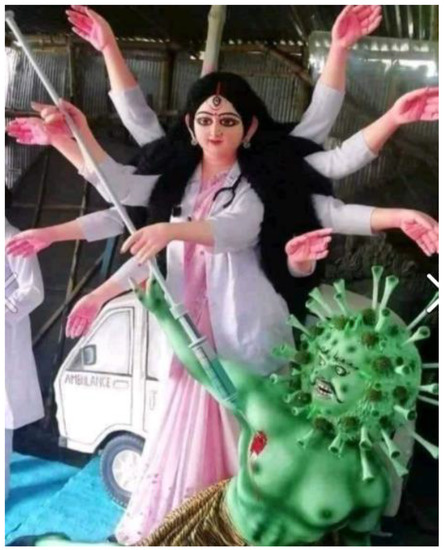 The paradigm of anthropomorphized disease goddess associated with the Corona demon-virus continued through the multiple waves of SARS-CoV-2. In the intervening period between the first and the second wave in India, in the month of October 2020, another Coronāsur appeared during the celebration of Durgā Pūjā, prominently celebrated in the region of Bengal and some parts of Bihar (see Figure 2). During Durgā Pūjā, Durgā herself adopted a new role and iconography. In some of the marquees (pāṇḍālas) designed for the occasion, she was depicted as a doctor similar to Bhārata Mātā, as was discussed above. In this case as well, Durgā left behind her traditional weaponry and instead adorned medical instruments. Along with the goddess, we again see the anthropomorphized form of the virus. Similar to the Coronāsur of Mumbai, the traditional demon, Mahiṣāsur has been replaced with Coronāsur and is being slayed by the goddess (see Figure 2).