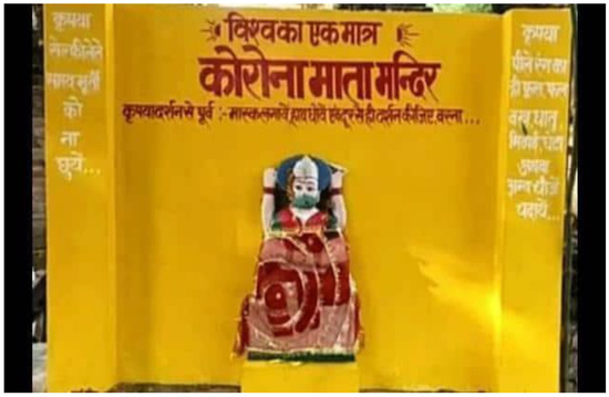 Simultaneously, we also find folk traditions developing around Corona Mātā. Arnold observes that smallpox was conceptualized not as a disease but rather as a form of divine possession by Śitalā Mātā. Consequently, the signs of possession—burning fever and pustules which mark her entry into the body—demand ritual rather than therapeutic approaches (Arnold 1993, p. 121). A similar practice and belief have also been seen in the case of SARS-CoV-2. In many parts of rural Bihar, rituals in agrarian fields have been offered to the supposed ‘Corona Māi’ (Corona mother) whose anger has been viewed as the cause of the outbreak.19 As opposed to the digital media imagination, this idea of the goddess follows the tradition of disease goddesses of the Indian Subcontinent very closely, in terms of her iconography, role and associated rituals. In the same year, Maharashtra’s Sholapur district saw its first Corona Mātā temple built by the Pardhi community in order to offer worship and pacify the goddess, much like the beliefs popular in the state of Bihar.