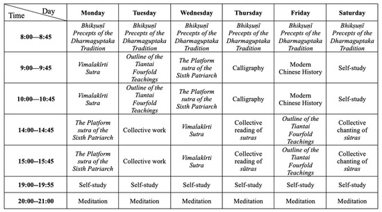 | 62 | Making up for an overall agenda of 42 h per week, six days a week from Monday to Saturday. In 2019, student-nuns had three 45-min classes from 8:00 to 10:45 a.m., then two more from 2:00 to 3:45 p.m., plus self-study (zixi 自習) and meditation in the evening from 7:00 to 9:00 p.m. |