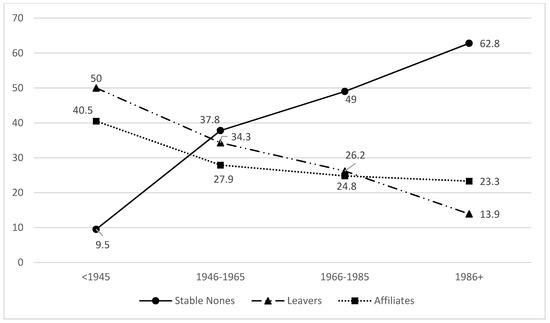 Stable nones, leavers, and affiliates by cohorts.