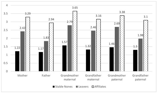 Besides the active transmission of religion, another aspect is considered elementary: namely, the atmosphere in the childhood family, i.e., how the general attitude towards religion was, but also how close the relationships with parents and grandparents were. As for the overall role of religion in the family, the three groups studied differ significantly from each other. Again, it is the stable nones who report that religion hardly played a role (mean of 1.27 on a scale from 1 “not at all” to 5 “a lot”). Religion played a comparatively large role for the affiliates (3.53), while the leavers are pretty much in between (2.41; see Table A4 in the Appendix A).