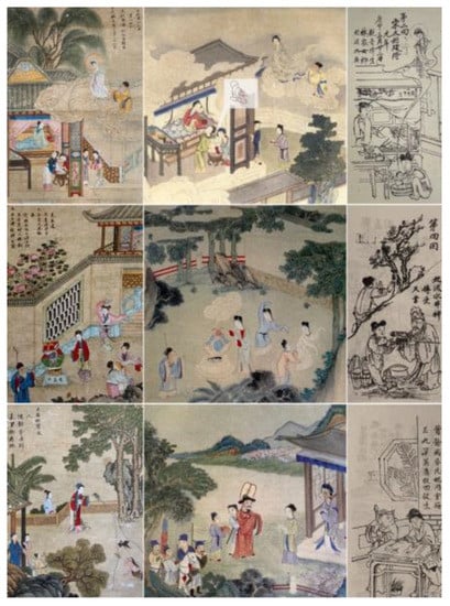 Folks in Fujian regard Mazu as a spiritual mother, and the people regard him as a close relative who lives with him in the same country. Therefore, Mazu, as a “homeland god”, is popular in Fujian folk society and folk life. However, there is no specific description of the Mazu image in early historical documents. The initial Mazu image can be found in some existing flat images depicting the Mazu stories since the Ming (1368–1644) and Qing dynasties. The traditional images of Mazu stories, whether folk or official, are either painted on silk paper and framed for hanging, engraved and printed in books, or depicted on the two walls of Mazu temples, which not only popularize and publicize Mazu beliefs, but also enhance the believers’ understanding of Mazu’s life and spiritual stories. Whether the Qing dynasty fine brushwork painting Scroll Record of Sagely Manifestation from the Celestial Empress (Tianhou xiansheng tuzhou 天后顯聖圖軸) collected by Fengtang Palace (a folk village temple) in Xiangyou, the Pictorial Record of the Miracles Performed by the Holy Mother and Heavenly (Tianhou shengmu shiji tuzhi 天后聖母事蹟圖志) collected by the National Museum of China, or the line-bound book The Full Picture of the Treasure Image of Lin Mazu (Lin Mazu zhi quantu baoxiang 林妈祖志全图宝像) in the Republic of China, it depicts the birth of Mazu in the form of a mortal baby (shown in Figure 2). The mother who just gave birth to Mazu is sitting on a bed inside the house, and a white-clothed Guanyin (Baiyi guanyin 白衣觀音) is painted above the house, indicating that Mazu is given by Guanyin. This portrays that Mazu was age 16 when she received the talisman (shenfu 神符) from the God of Wells (jingshen 井神), who was a mortal girl with her head in a double bun (shown in Figure 2: middle). After Mazu obtained the talisman and gained some sorcery divinity, perhaps sprinkling water with a talisman to subdue ghosts in the Gaoli 高里 Township, perhaps the Putian 莆田 county officials asked Mazu for the talisman to fight epidemics and save people, or perhaps Mazu usd the talisman to help the villagers cure diseases. Mazu is depicted as a young woman in a robe (beizi 褙子) or a skirt (ruqun 襦裙) (shown in Figure 2: below).