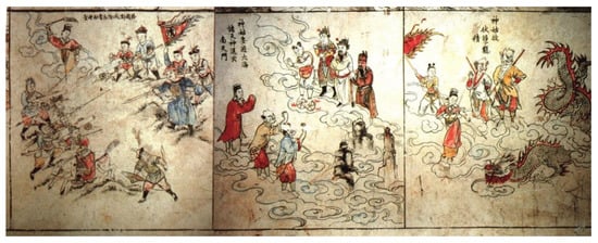 When Dr. Klaas Ruitenbeek, a researcher at the University of Munich, visited Fengting 枫亭 Town of Xianyou 仙游 County in 1991, he took pictures of the Mazu Temple in Fengting Town, Xianyou County and murals about the miracle of Mazu were painted on the walls on both sides (Ruitenbeek 1998). There are four rows and seven columns of murals, which are composed of 28 small paintings. Among them, the caption reads “The holy mother helps the Qing army eliminate Zheng Guosheng” 聖母助清兵除滅鄭國勝 in the second column of the fourth row (Figure 3: left), “The goddess quells the evil dragon spirit” 神姑收伏孽龍精 (Figure 3: middle), and “The divine nun wants to swim in the sea and the gods send her out of the Southern Heavenly Gate” 神姑要游大海 諸天神送出南天門 appear in the fifth and sixth columns of the fourth row (Figure 3: right). In these three murals, Mazu’s appearance is almost the same, wearing a red robe outside, a long yellow skirt inside, a scarf in a bun (ji 髻), and a light-colored, four-fold Ruyi 如意 pattern-style cloud shoulder (yunjian 雲肩). Mazu is stepping on auspicious clouds (xiangyun 祥雲), or waving fly whisk (fuchen 拂塵) with his hands, or depicted with both hands covering the sleeve to make a bow (yi 揖), or both hands holding the sword shape. This is a folk painter, who vividly depicts the spiritual and approachable Mazu image in the eyes of Fengting villagers in a simple, rural way.