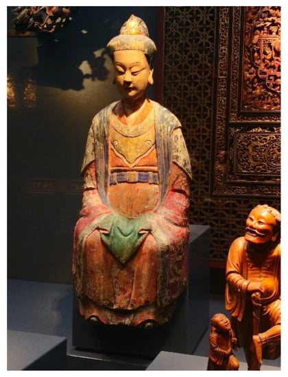Mr. Bozhong Li 李伯重 believes: “In the study of Mazu, a key issue is the Mazu image” (Li 2004, p. 288). If researchers do not understand the Mazu image correctly, there will be confusion in the research process, leading to different research conclusions. Mazu’s image is constantly changing over time and place. “Mazu is a goddess of a thousand-faced Avalokitesvara (Qianmian guanyin 千面觀音). The Mazu seen by different people is only an image formed by certain aspects of her” (Li 2004, p. 289). At present, scholars have discussed the “Mazu image” from different angles, and there are many related works and papers. They all provide in-depth analyses of the image of Mazu and give their unique interpretations of the image of Mazu in specific contexts, involving disciplinary research perspectives such as folklore, anthropology, religion, literature, iconography, and history (Li 1995, 1997; Lin 2003, 2020; Yu 2007; Zheng 2013; Wang 2014).