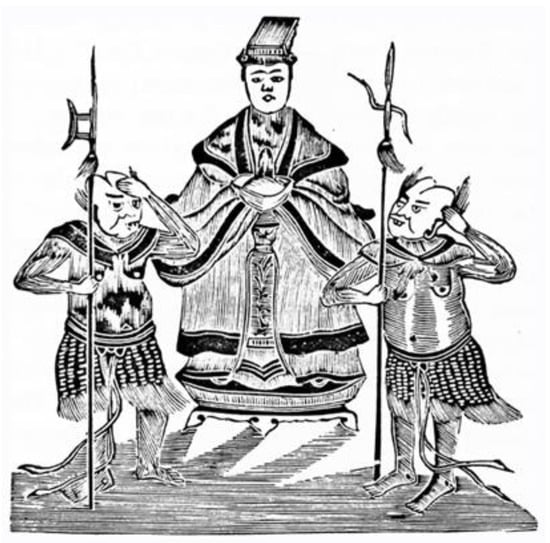 Mr. Bozhong Li (1997) says that, according to the country and society, the social function and the belief area, the Mazu image can be divided into three major images, namely, “homeland god” (xiangtu zhi shen 鄉土之神), “official god” (gongwu zhi shen 公務之神) and “maritime god” (haishang zhi shen 海商之神). The evolution of the Mazu image includes not only the respective changes in the three major images but also the differences between them. The same is true of the initial, transformed, and typical images in the Mazu image and the statue. The three images have obvious characteristics and certain intersections and connections. Therefore, the author believes that there are certain causes and consequences between Mazu’s “three figures” and “three images” (as shown in Figure 1). Based on this, the following will be based on the three figures of “homeland god”, “official god” and “maritime god” summarized by Mr. Bozhong Li, focusing on the evolution and relationship of the initial image, transformation image and typical image of Mazu in the picture and statue.