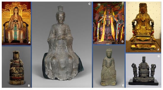 The image of Mazu in three-dimensional statues since the Ming and Qing dynasties ((A) Bronze Statue of Mazu in Xianying Palace, Temple Island 廟島; (B) The painted wooden statue of Mazu in the early Qing dynasty in the Tianhou Palace, Lukang, Taiwan; (C) The bronze statue of Mazu in the Ming Dynasty collected by Nantong 南通 Museum; (D) Hard-bodied Mazu statue at Kaiji 開基 Tianhou Temple, Tainan City, Taiwan; (E) Carved wooden statue of Mazu in Zhenlan Temple, Dajia, Taiwan; (F) Statue of Mazu from Laoshen Tang 老神堂, Tainan City, Taiwan; (G) Statue of Mazu in Qing dynasty in Japanese Museum). Source: Photographed by the author.