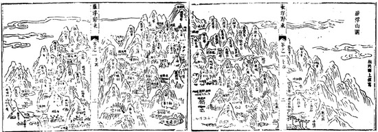 Panorama of the Luofu Mountains in Huang Zuo’s Luofu shan zhi, 1552. Woodblock print. After Huang Zuo, Luofu shan zhi, 1.1b-3a.