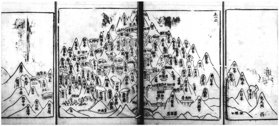 Han Huang passed the provincial civil service examination and was made juren in 1600.10 The government appointed him magistrate of Qingtian County in Zhejiang Province, where he served as an official of integrity until his retirement (Ibid.). After finishing his service, Han Huang returned to his hometown where the Luofu Mountains are situated, and he devoted his life to compiling Yesheng, which was first published in 1639.11 It is said that soon after he learned that the Qing took the throne, he died of a broken heart.12 Han Huang introduces the Luofu Mountains by elucidating six core aspects and showcasing records from different historical periods; as a personally compiled gazetteer, Yesheng focuses on the geographical and cultural features of separate topics and “transcends dynasties, whereas histories cover single dynasties” (Dennis 2015, p. 1). In Yesheng, the first juan 卷 (chapter) presents a four-page panorama (Figure 1) of the Luofu Mountains, which is followed by some general relevant historical and mythological information and poems by contemporaneous and previous literati.13 The second juan lists 24 natural sites scattered within the Luofu Mountains; each has a fentu 分圖 (individual image of specific sites), an introduction written by Han Huang, and several related poems written by literati in previous dynasties.14 The third juan elaborates on the natural sites in the second juan, introducing the human-made sites within each natural site by briefly describing the location and history and by cataloging more poems that illustrate the views within.15 The fourth juan familiarizes readers with the well-known Daoist immortals and Buddhist saints who had been cultivated in the Luofu Mountains since the Qin dynasty (221–206 BCE).16 The fifth juan introduces the local products and rare animals of the Luofu Mountains.17 Finally, the last juan presents related stories and strange events said to have occurred within the Luofu Mountains.18 Different from the first two, the third through sixth juans do not contain images and comprise only text.