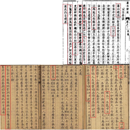Comparison between the Feiyun Feng texts in Han Huang and Han Mingluan’s books. The red frames mark the same expressions in both texts. Upper: after Han Huang, Luofu yesheng, 2.8b (503), 2.10b (504); below: after Han Mingluan, Luofu zhi lue, 1.51b, 1.75b. Image edited by the author.