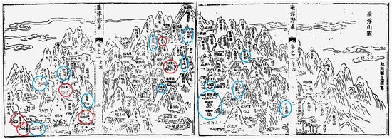 Panorama of the Luofu Mountains in Huang Zuo’s gazetteer, marked with Daoist (blue) and Buddhist (red) sites. Image edited by the author.