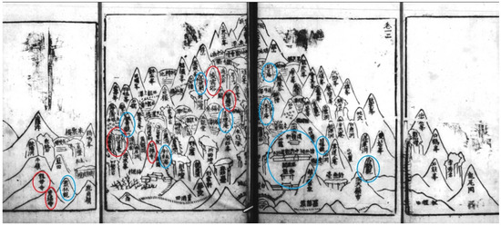In addition to the fentu, Han Huang’s panorama indicates his attention on religious architecture too, depicting the topography where the three traditions, Daoism, Buddhism, and Confucianism, co-existed harmoniously. According to the panorama, while the Daoist buildings are scattered across both the left and right parts of the panorama, Han Huang placed the Buddhist sites mainly on the left. This panorama reveals information on how the distribution of religious sites was designed. In investigating the distribution of these religious buildings, it is important to first refer to the geographical situation of the Luofu Mountains and panoramas in previous gazetteers. As mentioned at the beginning of this article, the Luofu Mountains consist of two peaks: Luo Mountain and Fu Mountain. The sites mentioned in the above list are separately located across the two mountains. On Luo Mountain, the main sites are around the Zhuming Dong, where Chongxu Guan lies, while on Fu Mountain, Buddhist sites such as Yanxiang Si and Baoji Si are the most visited (R. Li 2021, pp. 254–255). In the panorama in Huang Zuo’s gazetteer (Figure 5), the Fu and Luo Mountains are located on the left and right parts of the composition, respectively.73 As imitated by Han Huang, the Huang Zuo panorama also locates Buddhist sites on the left, while the Daoist buildings are scattered across the entire composition. As for the Confucian sites, the Zhang Liu Shuyuan and Yuzhang Shuyuan located around the Huanglong Dong are both placed at the very far left of the panorama. Following the distribution of these sites, by marking the Luo and Fu Mountains on the top of each side of Luofu, Huang Zuo’s panorama seems to indicate that the left two pages mainly contain the sites on Fu Mountain, while the right two mainly contain the sites on Luo Mountain. In reviewing the Han Huang panorama, it is evident that although the peak indicating the Luo Mountain has been wiped out, it still follows the basic distribution of the panorama in Huang Zuo’s gazetteer, depicting sites on both Luo and Fu Mountains. As a result, while Han Huang scattered Daoist sites across all of Luofu, he distributed the Buddhist sites mainly in the region of Fu Mountain.