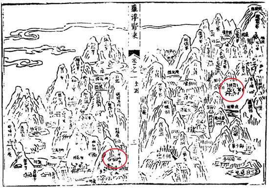 Evidence proving that Han Huang referred to previous gazetteers can be found by comparing Yesheng and other gazetteers that were previously published. First, Han Huang’s panorama shows clear similarity with Huang Zuo’s Luofu shan zhi 羅浮山志 (Gazetteer of the Luofu Mountains, Figure 2), published in 1552. Both panoramas are divided into four pages. Although Yesheng depicts the mountainous structure in a more detailed manner than that of Huang Zuo’s panorama, the natural sites along the contour of the mountain follow the same sequence on each page of the panoramas, shaping the Luofu Mountains with the same composition. From the bottom right to the top left on the first and second pages, that work illustrates the Baihe Feng 白鶴峰 (White Crane Peak), Xiannü Feng 仙女峰 (Fairy Peak), Zhiyun Feng 致雲峰 (Cloud Path Peak), Xiaoqi Feng 小旗峰 (Small Flag Peak), and nearby sites, with the Feiyun Feng 飛雲峰 (Flying Cloud Peak) at the very top. On the third and fourth pages, the work presents sites such as the Shangjie Sanfeng (Three Peaks of the Upper Realm), Fushan 浮山 (Floating Peak), Penglai Feng 蓬萊峰 (Penglai Peak), Yunmu Feng (Mica Peak), and Xiao Luofu 小羅浮 (Minor Luofu), which are sequentially located between the Feiyun Feng and the foothills. Additionally, important human-made sites are all placed at the same positions. For example, the Chongxu Guan 沖虛觀 (Unfathomable Emptiness Abbey) is situated below the Zhuming Dong 朱明洞 (Vermilion Brightness Grotto), the Baoji Si 寶積寺 (Treasure Accumulation Temple) is presented between the Zhong Ge 中閣 (Middle Pavilion) and Shutang Keng 書堂坑 (Study Hall Cave), and the Shuzhu An 黍珠庵 (Millet Beads Hermitage) is located between the Zhuoxi Quan 卓錫泉 (Tin Poking Spring) and Yele Chi 夜樂池 (Night Joy Pond).27