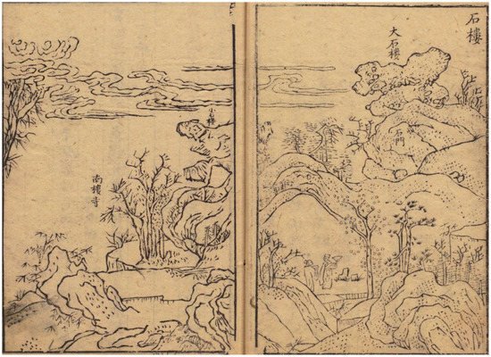 The designer and engraver of the images in Yesheng remain anonymous; however, on the right of the panorama, there is an answer—an inscription that reads “written and engraved on the twin peaks of Longgang” (Longgang queshang kexie 龍岡闕上刻寫), which might at least indicate the location of the engraver. A poem titled Moling 秣陵 (referring to modern-day Nanjing, in Jiangsu Province) by the famous Guangdong poet Qu Dajun 屈大均 (1630–1696), may reveal the location of Longgang: