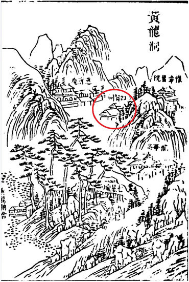The image of the Zhuming Dong can be taken as another example. Depicted in the image (Figure 8) are sites such as the Gexian Ci, Yiyi tan 遺衣壇 (Terrace of Leftover Clothes), Dan Zao 丹竈 (Elixir Hearth), Yiguan Zhong 衣冠冢 (Tomb of the Attires), Xiyao Chi 洗藥池 (Pond for Medicine-Washing), and the leading site Chongxu Guan, a sacred site of the Lingbao 靈寶 (Numinous Treasure) sect of Daoism before the Qing dynasty.80 Legend has it that the Chongxu Guan was first named Duxu Guan 都虛觀 (Metropolitan Emptiness Abbey) or Xuanxu Guan 玄虛觀 (Mysterious Emptiness Abbey) and built by the elixir master Ge Hong during the Jin dynasty; in 1087, the abbey was finally renamed Chongxu Guan.81 Few historical accounts regarding the reconstruction of the Chongxu Guan during the Ming dynasty survive today (C.-T. Lai 2007, p. 80). However, supplementarily, based on knowledge from previous gazetteers, the late Qing literatus Chen Botao summarized the situation of the Chongxu Guan in the Ming: