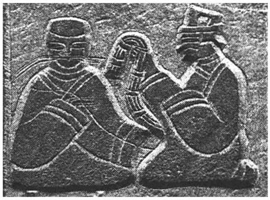 Silkworm deity images in wood engravings of the Northern Song Dynasty: (a) “Silkworm mother 蚕母” (Chen 2020, pp. 59–62)2. Colorful wood engraving. Guoan 国安 temple stone tower in Wenzhou, Zhejiang, China; (b) “San-Gu Zhi Can 三姑置蚕” (Shi 1981, pp. 70–71)3. Book of rubbings. Wood engravings from the Northern Song Dynasty (960–1127). Collected at the National Museum of China.