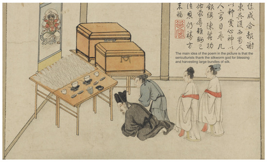 The illustrations “Silkworm deity “and “Can Tan 蚕坛” are two of the illustrations of silkworm affairs in the Agricultural Book. The sacrificial images in “A picture of Farming and Weaving 耕织图” also belong to the lineage of silk production. The location is based on the actual production sequence of silkworm rearing and reeling. From the sequence of these three images and images showing other production links, the worship activities shown in the illustrations of “Silkworm deity “and “Can Tan” are ahead of all silkworm production links, reflecting the ritual of “sacrificing to the Silkworm deity”—that is, silk worship activities are held on the day when the silkworm cocoons hatch. The worship scene in “A picture of Farming and Weaving” takes place after the silkworm cocoon harvesting and silk reeling processes, as there are many bunches of silk on the offering table. It can be seen that it reflects the ceremony of “thanking the Silkworm deity”—that is, worship activities after the silk reeling. During the worship, the silk is usually placed on the altar, and then, the silkworm deity is asked to bless the successful completion of the silkworm activities.