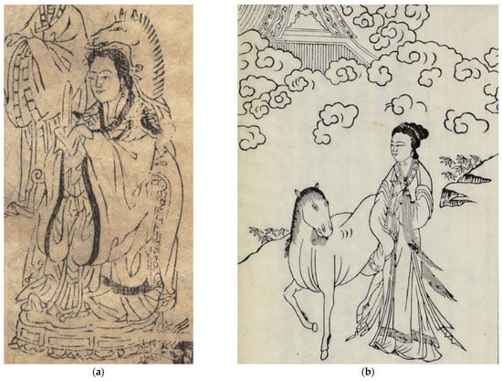 The statue of “Ma-Tou-Niang”: (a) “Ma-Tou-Niang”. Photo Source: Nong Shu 农书 (1304); (b) “Silkworm girl 蚕女”. Photo Source: San Jiao Yuan Liu Sou Shen Da Quan 三教源流搜神大全 (1909).