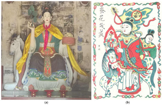 “Ma-Tou-Niang”: (a) The statue of “Ma-Tou-Niang”. Mian-Hua-Dian 棉花殿, Jinan, China. Photograph taken by the authors; (b) Can Hua Mao Sheng 蚕花茂盛” (Shen 2015, p. 225). Taohuawu 桃花坞 Wood Engraving New Year pictures.