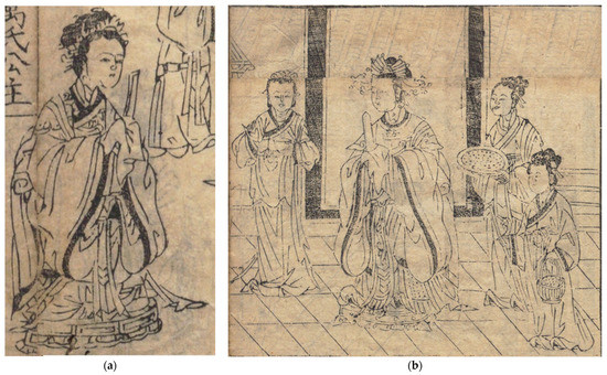 By the Jin Dynasty (266–420 CE), the two silkworm deities had merged into one, so there was a single silkworm deity named “Princess Yu of Yuan-Yu woman” in the illustration of the “silkworm deity” in Nongshu 农书 of the Yuan Dynasty (Figure 8a). According to Sou Shen Ji 搜神记, “Yuan-Yu Woman” is the founder of the silk industry, and “Princess Yu” is her honorific (Gan 2019, p. 335). Although “Yuan-Yu woman” was a low-level aristocrat, she was promoted to a higher level because of her invention of sericulture, and so was honored as a “princess”. The status of “Xian-Can” changed from the wife of a scholar to a princess, thus her being included in the order of the ruling class. This indicated the promotion of the status of the silkworm deity under the influence of the feudal social hierarchy. Only by raising the status of “Xian-Can” as a member of the royal family can she be worthy of the royal sacrificial rites, which is an example of the feudal hierarchy of Confucianism. Therefore, although “Yuan-Yu Women” and “Princess Yu” were no longer the “Xian-Can” to be offered official sacrifices in the Jin Dynasty, as the object of royal sacrifices, they still needed to be identified as princesses, which was in line with the norms of social etiquette based on Confucianism.