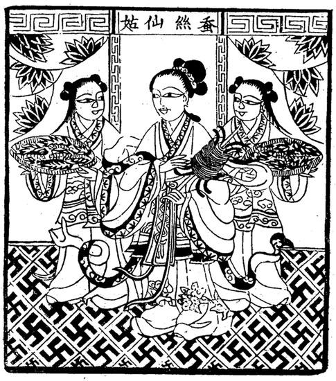 After that, based on the creation and popularization of woodblock printing, the silkworm deity spread widely through ancient Chinese society in the form of art. Woodblock prints and illustrations of block-printed books are the material carriers of such art, and both use the same processing method. The silkworm deity image in the woodblock prints is represented by painting or in combination with simple words, and usually exists independently. The illustrations usually exist in a book. Such books are characterized by a combination of paintings and narrations. The image of the silkworm deity is always accompanied by text describing its name, origin, and the plots of some narrative stories about the silkworm deity, so they are more complete and detailed than the woodblock prints.