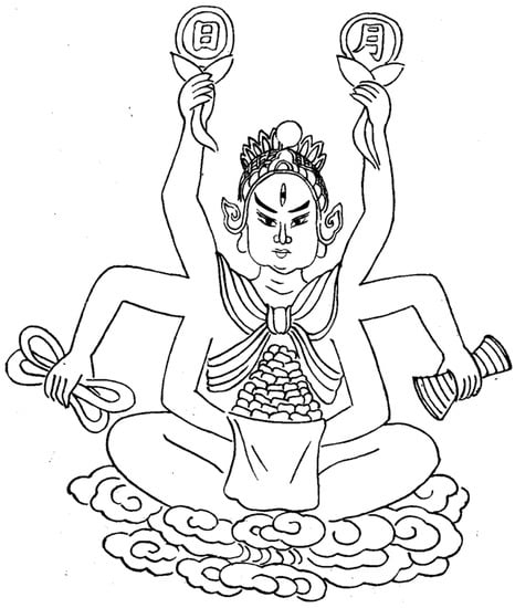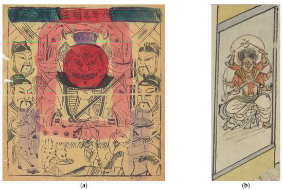 The name of Shui-Cao-Ma-Ming-Wang is influenced by Buddhist culture. The Sanskrit of “Ming Wang 明王” is Vidyā-rājā; it is regarded as “God” in the folk tradition, and Ma-Ming-Wang is the Horse God. The prefix “Shui Cao 水草” refers to livestock protected by the Horse God that feed on water and grass. The folk image of Shui-Cao-Ma-Ming-Wang is generally four arms and three eyes (Figure 11a), with the third eye a vertical one in the middle of his forehead. The image of “Ma-Ming-Wang” with eight arms and three sides appeared in “A picture of Farming and Weaving” of the Yuan Dynasty (Figure 11b), in which three pairs of arms extend outward, holding weapons such as double swords and bows and arrows from top to bottom, and the hands of another pair of arms are placed palms together at the chest.
