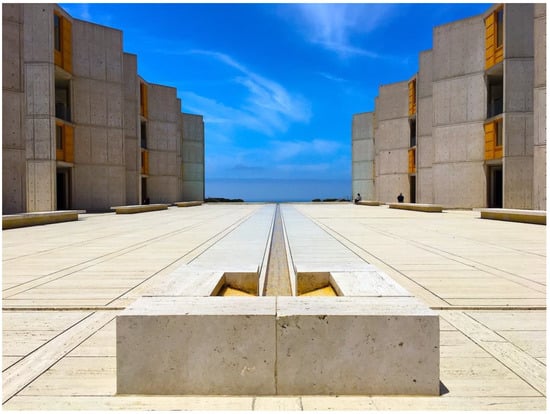 A particularly iconic instance of an architectural setting seen to have contributed to someone’s mental health and power is that of Dr Jonas Salk, who, when he felt his brain ‘overloaded,’ decided to go on a retreat to the Franciscan basilica in Assisi, the architectural setting which he later credited with his having had the intellectual breakthrough that resulted in the creation of the polio vaccine (Eberhard in ). The impression on him was such that he was convinced ever after that architecture has the power to profoundly influence our mental state of being. When the City of San Diego gifted him with 27 acres overlooking the Pacific Ocean in 1960, he partnered with the architect Louis Kahn to design a long-planned research centre. His brief to Kahn was to “create a facility worthy of a visit by Picasso.” Opening in 1963, it has inspired countless researchers in their work and ended up on the must-visit list of such eminent architects as Juhani Pallasmaa, who recounts it among the most sacred spaces in the world (Figure 1).